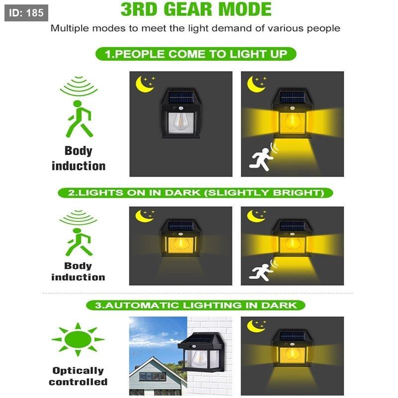 כאשר מזוהה תנועה, הוא יופעל ל-100%, אור הקיר הסולארי ישתנה ל-50% בהירות לאחר שהתנועה עוזבת למשך 15 שניות.