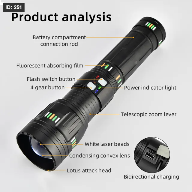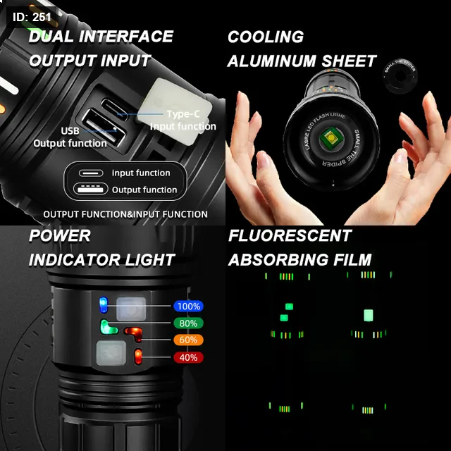 ניתן להטעין טלפון נייד באמצעותו (פאוורבנק) פנס בעוצמת תאורה גבוהה מאוד עם קרני UV כיסוי שטח רחב מאוד לאורך ולרוחב מתאים לטיולים, קמפינג, ציד, אנשי ביטחון